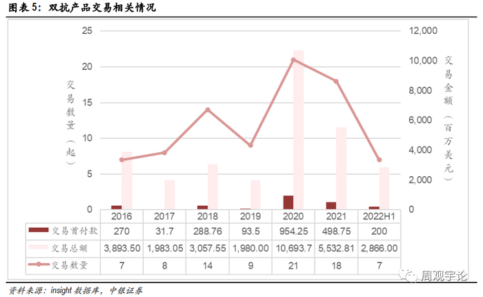 双抗产品相关权益交易活跃。尽管全球范围内上市的双抗产品上市的产品不算多,但是产品相关的权益交易在近几年呈现非常活跃的状态。2020年双抗交易达到峰值,交易事件达到21起,仅交易首付款就已经达到9.5亿美元规模。