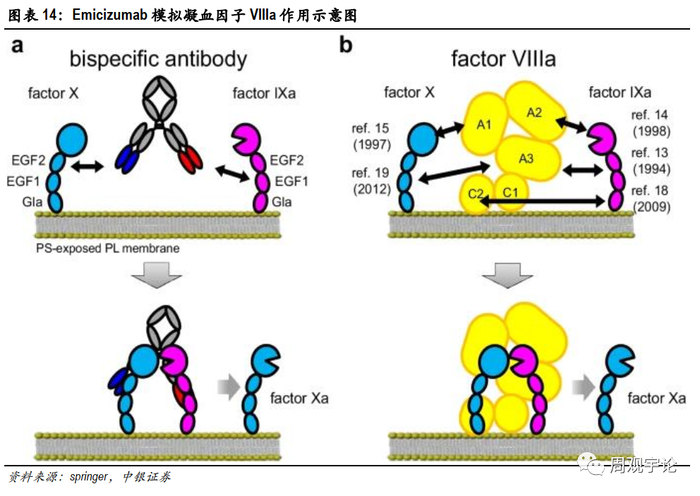 桥联因子:双抗可以作用体内游离的因子,促进形成蛋白复合物发挥作用。例如RG6013(Emicizumab)介导凝血酶的组装。健康人体内的凝血级联因子IX和X在凝血因子VIII的作用下结合在一起发挥止血作用,A型血友病的患者体内不能表达VIII,通常的治疗方案是外部注射补充VIII,但某些患者会产生免疫反应,VIII本身的半衰期也较短(小于15小时),会被迅速清除。经过设计的人源化双抗可以提供更低的免疫反应和更长的半衰期,可以提供更好的治疗效果。