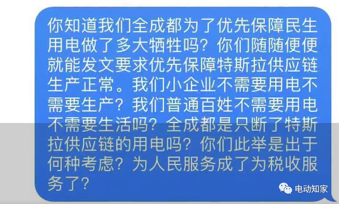 “你知道我们全成都为了优先保障民生用电做了多大的牺牲吗?你们随随便便就能发文要求优先保障特斯拉供应链生产正常,我们小企业不需要用电不需要生活吗?全成都都是只断了特斯拉供应链的用电吗?你们此举是出于何种考虑?为人民服务成了为税收服务了?”
