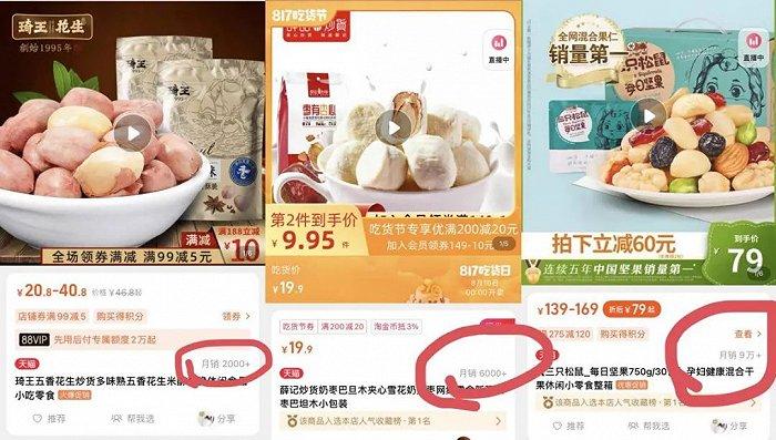 薛记炒货和琦王花生在线上都有官方店,从数据来看,这两家各自当红产品的月销量与三只松鼠等深耕线上多年的零食品牌相比,仍相去甚远。而规模更小的欢喜花生还没有开设淘宝、京东店,只在微信小程序上售卖。