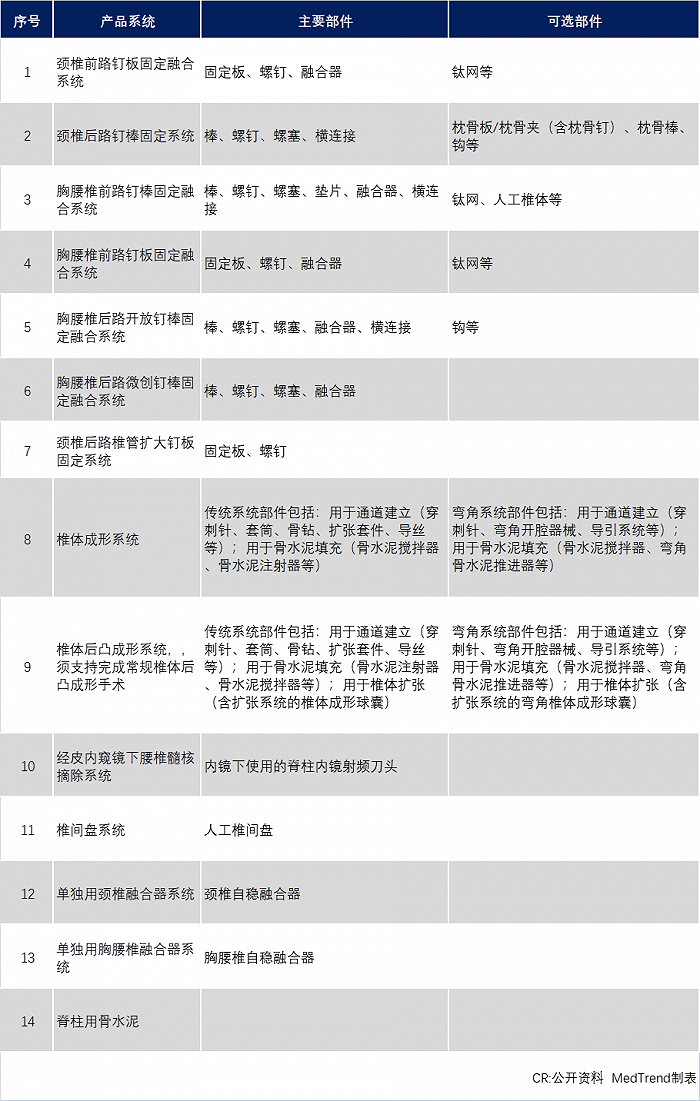 在7月11日发布的脊柱国采1号文中,根据手术类型、手术部位、入路方式等,囊括进了14套脊柱系统(详情见文末),相比征求意见稿,将脊柱用骨水泥单独列出,更符合市场情况。