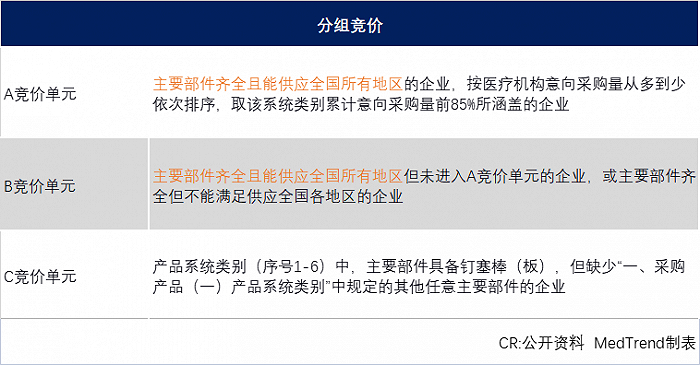 在竞价单元中,去年关节国采仅有AB两组,本次脊柱国采因为产品系统更加复杂,因此根据不同的情况设置了ABC三个竞价组,可简单理解为: