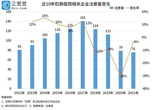 企查查数据显示,我国目前共有超1千家肛肠医院,四川湖南肛肠医院全国最多,其中四川133家和湖南72家排前二,吉林辽宁59家并列第三。其后依次为重庆、江苏、黑龙江、湖北、山西和山东。近年来,我国新增肛肠医院多保持在100家以上。