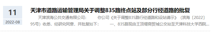 天津市道路运输管理局关于调整835路终点站及部分行经道路的批复