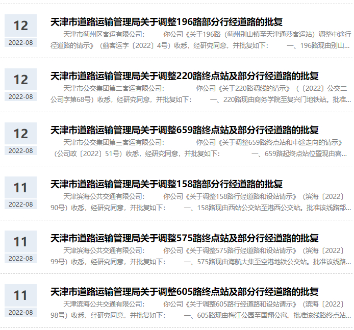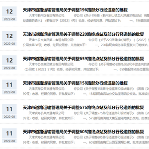近日,天津市道路运输管理局批复7条公交线路调整部分行经道路、终点站。其中涉及196路、220路、659路、158路、575路、605路、835路。调整后,这些公交线路都将有所延长。