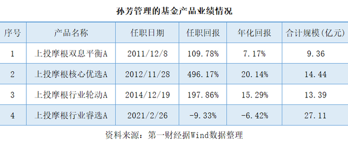 在离职前,孙芳的投资经理年限已超过十年,旗下共管理4只产品(不同份额合并计算),合计规模超64亿元。Wind数据显示,截至2022年8月18日,其中,其管理时间最长的是上投摩根双息平衡A,该基金自2011年12月8日成立以来的区间回报为109.78%;管理业绩最好的是上投摩根核心优选A,任职回报为496.17%,年化回报超过20%。