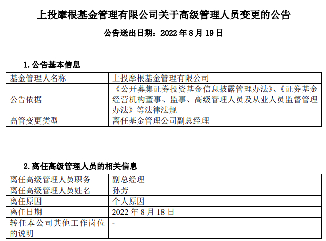 8月19日,上投摩根基金披露高管变更公告,公司副总经理、基金经理孙芳因个人原因离职,离职日期为8月18日。据悉,孙芳在上投摩根基金工作已经超过15年,是公司投研团队的领军人物之一。