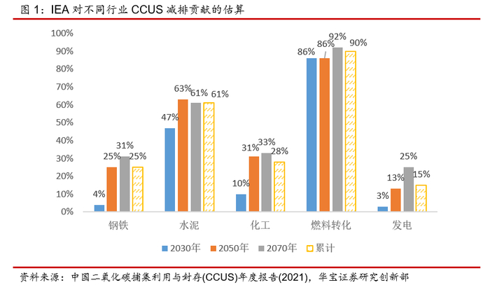根据华宝证券2021年12月24日发布的《碳捕集利用与封存技术:零碳之路的“最后一公里”》研究。在现有技术情形下,在部分行业减排路径中CCUS是不可跳过的关键一环。根据IEA对各行业CCUS减排贡献的测算,钢铁、水泥、化工、燃料转化、发电行业等在2020-2070年的过程中将会利用CCUS技术实现累计25%、61%、28%、90%、15%的减排量。贡献比例不同主要是由于不同行业使用CCUS的技术成本(排放源浓度不同所导致)、替代技术的可行性与相对成本等存在差异。