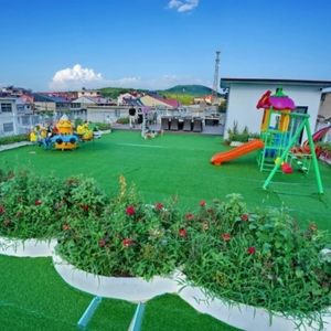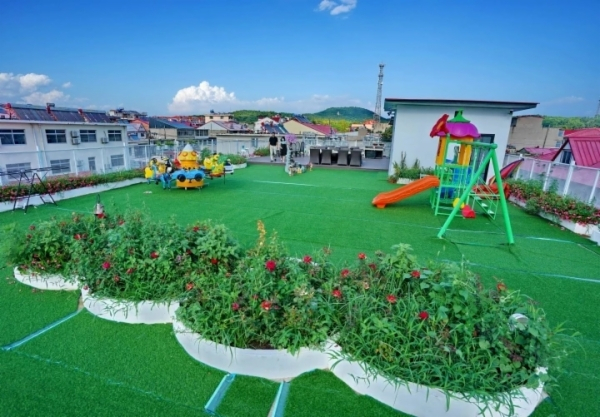 村民刘晓燕家民宿顶端的“空中花园”,是个孩子玩乐、大人休闲的好地方。