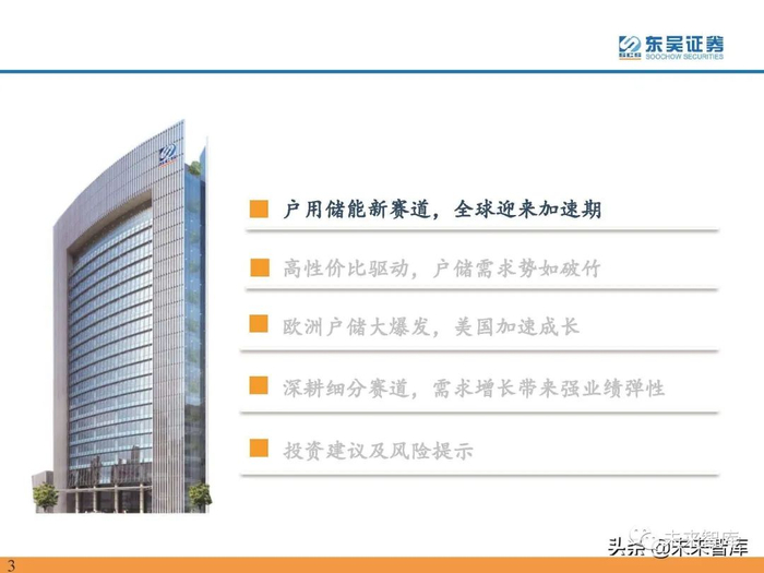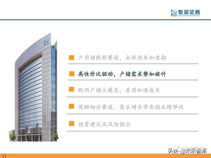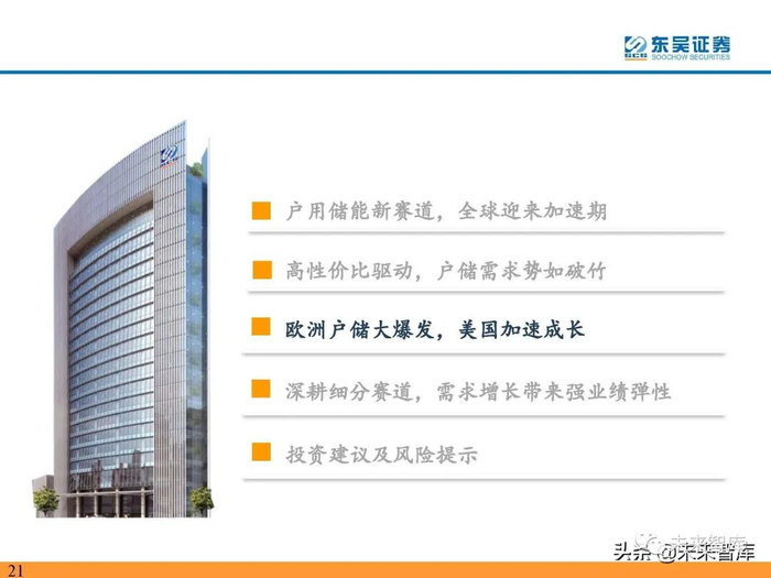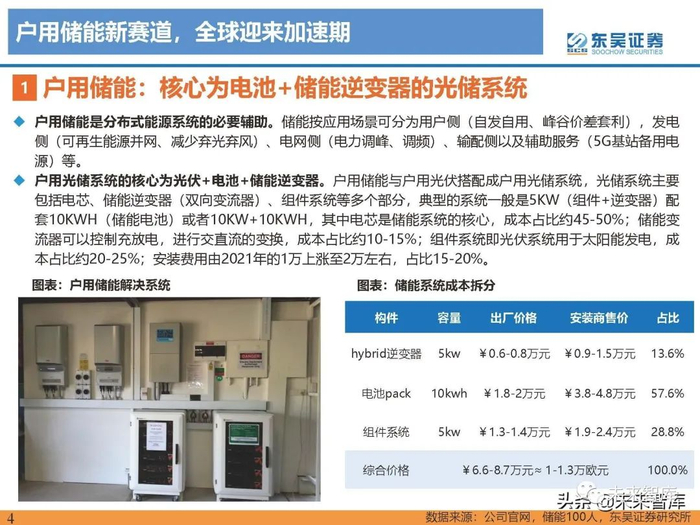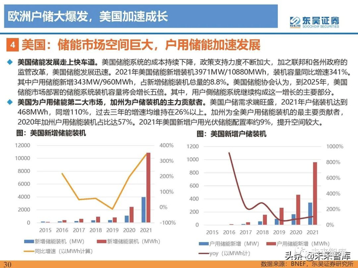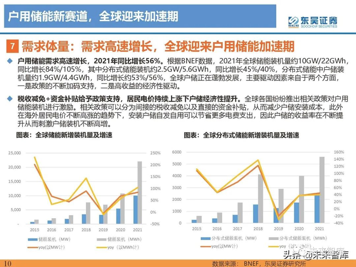 户用储能需求高速增长,2021年同比增长56%。根据BNEF数据,2021年全球储能装机量约10GW/22GWh, 同比增长84%/105%,其中分布式储能装机约2.5GW/5.6GWh,同比增长45%/40%,分布式储能中户储装 机量约1.9GW/4.4GWh,同比增长约53%/56%,全球户储正在蓬勃发展,主要驱动因素来自于两个方面, 一是政策的不断加码支持,二是高收益的经济性驱动。(报告来源:未来智库)