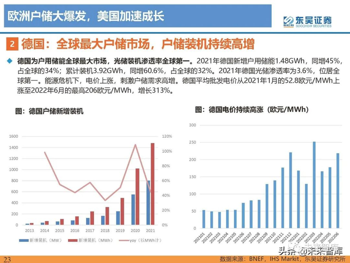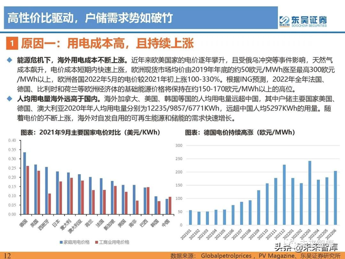 欧洲政策+经济性双驱动,户储大爆发,美国户储高成长。欧洲户储装机呈现爆发式增长,其中德国是全球最 大的户储市场,今年德国居民电价达到40欧分/kwh以上,较2021年初翻三倍,光储系统的回收期在7-8年, 如考虑各国出台税收减免或直接补贴等,投资回收期将进一步缩短至2-3年。(报告来源:未来智库)