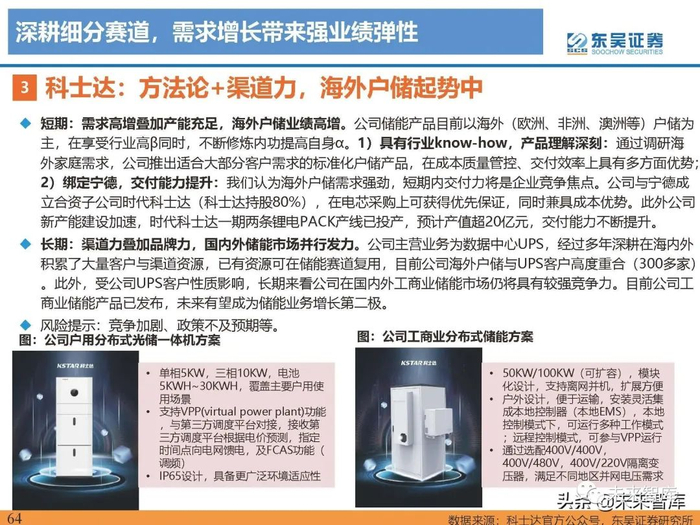 长期:渠道力叠加品牌力,国内外储能市场并行发力。公司主营业务为数据中心UPS,经过多年深耕在海内外 积累了大量客户与渠道资源,已有资源可在储能赛道复用,目前公司海外户储与UPS客户高度重合(300多家) 。此外,受公司UPS客户性质影响,长期来看公司在国内外工商业储能市场仍将具有较强竞争力。目前公司工 商业储能产品已发布,未来有望成为储能业务增长第二极。