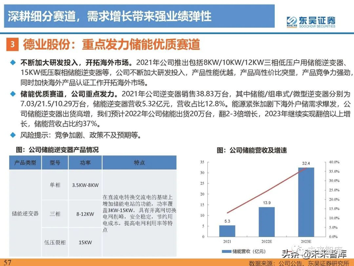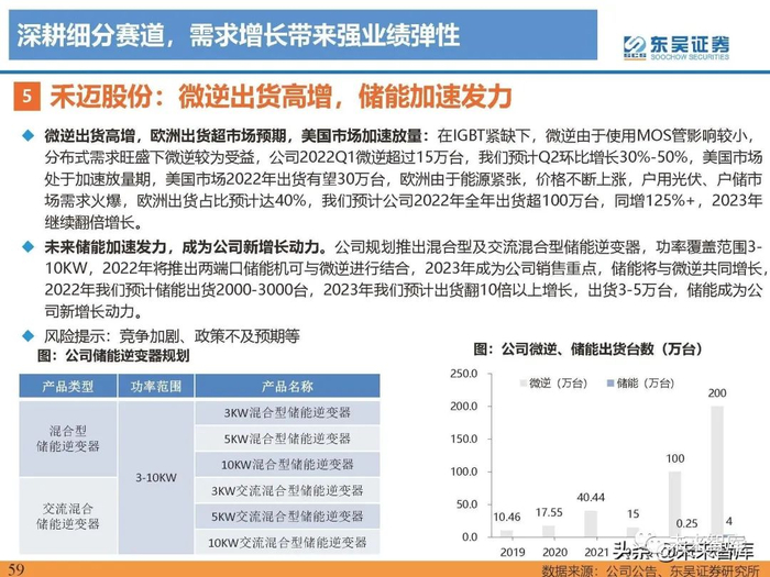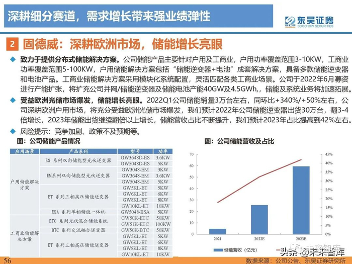 致力于提供分布式储能解决方案。公司储能产品主要针对户用及工商业,户用功率覆盖范围3-10KW,工商业 功率覆盖范围5-100KW,户用储能解决方案包括“储能逆变器+电池”成套解决方案,具备多款储能逆变器 和电池产品。工商业储能解决方案采用模块化系统配置,灵活匹配各类工商业场景。公司于2022年6月募资 进行产能扩张,将扩充公司并网/储能逆变器及储能电池产能40GW及4.5GWh,,储能及系统业务将加速拓展。