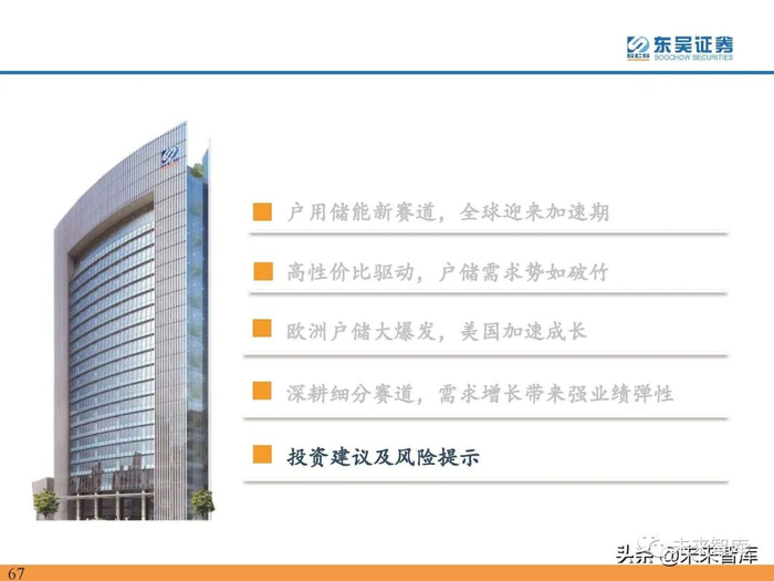 获华为订单超100GWh,入股沃太助力户储快速发展。公司储能产品使用铁锂路线,提供电芯、PACK、系统 等多种储能产品,覆盖领域包括电力、通信与户用储能,可提供容量50-304mAh,循环3000-7000次,放电 倍率1C、3C的10款方形铁锂产品。2016年参股国内大型户用储能系统供应商沃太能源,主要向其提供户储电 芯产品;并已获华为储能订单超100GWh,我们预计5-8年内交付。