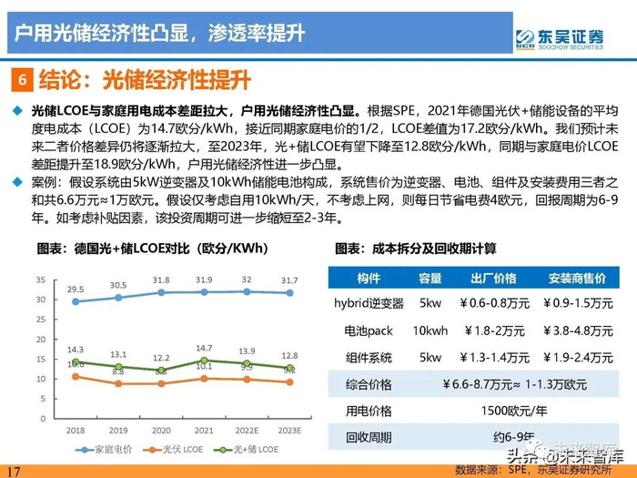 光储LCOE与家庭用电成本差距拉大,户用光储经济性凸显。根据SPE,2021年德国光伏+储能设备的平均 度电成本(LCOE)为14.7欧分/kWh,接近同期家庭电价的1/2,LCOE差值为17.2欧分/kWh。我们预计未 来二者价格差异仍将逐渐拉大,至2023年,光+储LCOE有望下降至12.8欧分/kWh,同期与家庭电价LCOE 差距提升至18.9欧分/kWh,户用光储经济性进一步凸显。
