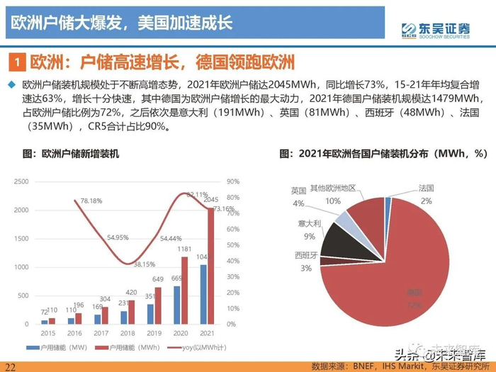 欧洲户储装机规模处于不断高增态势,2021年欧洲户储达2045MWh,同比增长73%,15-21年年均复合增 速达63%,增长十分快速,其中德国为欧洲户储增长的最大动力,2021年德国户储装机规模达1479MWh, 占欧洲户储比例为72%,之后依次是意大利(191MWh)、英国(81MWh)、西班牙(48MWh)、法国 (35MWh),CR5合计占比90%。