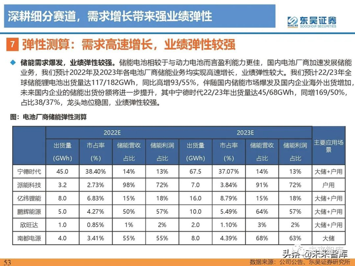 细分方向多点发展,户用储能海外认证领先,大型储能循环性能优异。公司储能产品采用铁锂路线,户储方面 ,向下游集成商供应电芯产品,产品循环寿命与安全性能优异,海外家储市场认证进度行业领先,我们预计 2023年公司可通过北美、日本认证,拓宽销售市场;大型储能方面,产品4500周循环容量≥80%,7000周循 环容量≥70%。