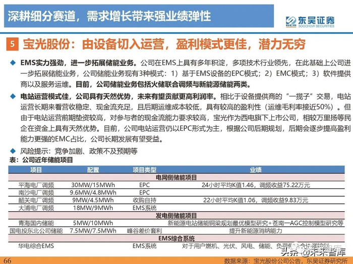 EMS实力强劲,进一步拓展储能业务。公司在EMS上具有多年积淀,多项技术行业领先,在此基础上公司进 一步拓展储能业务,公司储能业务现有3种模式:1)基于EMS设备的EPC模式;2)EMC模式;3)软件提供 商以及服务运维。目前,公司储能业务包括火储联合调频与新能源储能两类。(报告来源:未来智库)