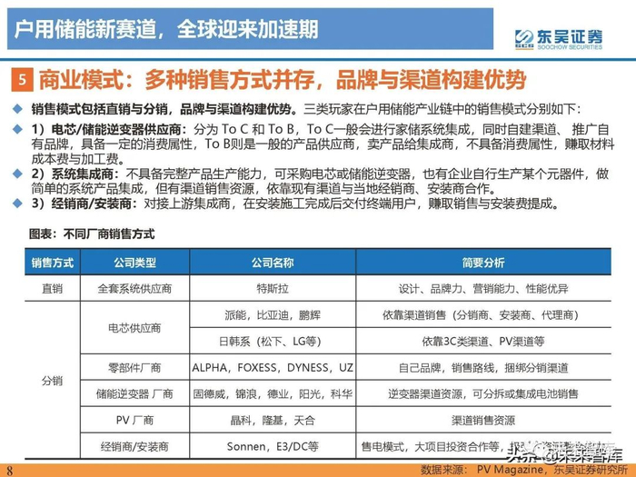 销售模式包括直销与分销,品牌与渠道构建优势。三类玩家在户用储能产业链中的销售模式分别如下:1)电芯/储能逆变器供应商:分为 To C 和 To B,To C一般会进行家储系统集成,同时自建渠道、 推广自 有品牌,具备一定的消费属性,To B则是一般的产品供应商,卖产品给集成商,不具备消费属性,赚取材料 成本费与加工费。