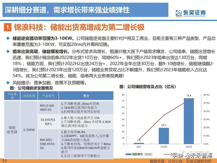 储能逆变器功率范围为3-10KW。公司储能逆变器主要针对户用及工商业,目前主要有三种产品类型,产品功 率覆盖范围为3-10KW,可实现20ms内并离网切换。组串出货高增,储能爆发增长。分布式需求高增长,能源价格大涨下户储需求爆发,公司组串、储能出货增长 迅速,我们预计锦浪组串2022年出货110万台,同增60%+,我们预计2023年组串出货达130万台,同增 18% ;储能方面,我们预计2022H2出货24万台+,2022年全年出货30万台,翻9-10倍增长,储能继续翻2- 3倍增长,我们预计2023年出货120万台,储能业务营收占比不断提升,我们预计2023年储能收入占比达 54%,成为公司第二增长极,储能、组串两大业务表现亮眼!