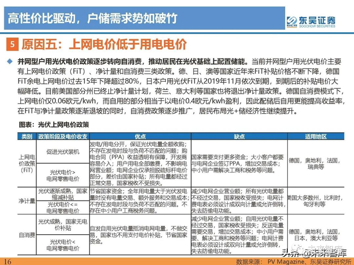 并网型户用光伏电价政策逐步转向自消费,推动居民在光伏基础上配置储能。当前并网型户用光伏电价主要 有上网电价政策(FiT)、净计量和自消费三类政策。德、日、澳等国家近年来FiT补贴价格不断下降,德国 FiT余电上网电价过去15年下降超过80%,日本户用光伏FiT从2019年11月依次到期,到期后的补贴电价大 幅降低。目前美国部分州已终止净计量计划,荷兰、意大利等国家也将退出净计量政策。德国自消费模式下, 上网电价仅0.06欧元/kwh,而自用的部分相当于以电价0.4欧元/kwh盈利,因此配储后自用更能提高收益率, 在FiT与净计量政策逐渐退坡的同时,自消费政策逐步推广,居民布局光+储经济性继续提升。
