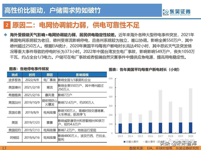 海外受极端天气影响+电网协调能力弱,居民供电稳定性较差。近年来海外各种大型停电事件突发,2021年 美国电网系统较为老旧,德州受寒流影响停电,且各州系统较为独立,难以协调,影响全美550万户,其中 德州超过250万人。根据EIA统计,2020年美国平均每客户断电时长高达492小时,其中恶劣天气及突发情 况等重大事件导致的停电时长为373小时。2022年中国台湾发生电厂事故,影响影响549万户,丧失1050万 千瓦,约占全台1/3电力。户储可在电厂事故或者极端自然灾害事件中提供应急电源,提高用电稳定性。