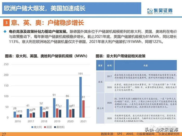 电价高涨及政策补贴力驱动户储发展。除德国外其余位于户储装机规模前列的意大利、英国、奥地利在电价 与政策推动下,每年新增户储装机规模稳步增长。截止2021年底,英国户储装机规模为81MWh,同比增长 113%,意大利在欧洲地区户储装机量仅次于德国,2021年意大利户储装机191MWh,同增122%。
