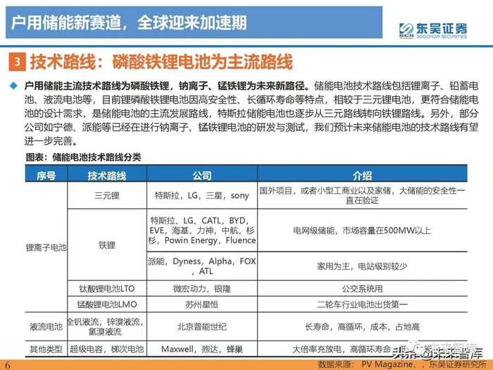 户用储能主流技术路线为磷酸铁锂,钠离子、锰铁锂为未来新路径。储能电池技术路线包括锂离子、铅蓄电 池、液流电池等,目前锂磷酸铁锂电池因高安全性、长循环寿命等特点,相较于三元锂电池,更符合储能电 池的设计需求,是储能电池的主流发展路线,特斯拉储能电池也逐步从三元路线转向铁锂路线。另外,部分 公司如宁德、派能等已经在进行钠离子、锰铁锂电池的研发与测试,我们预计未来储能电池的技术路线有望 进一步完善。