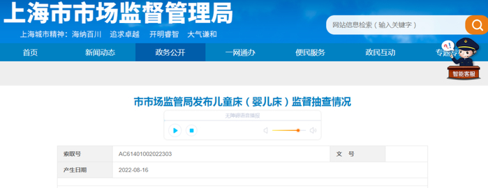 近日,上海市市场监管局发布儿童床(婴儿床)监督抽查情况。
