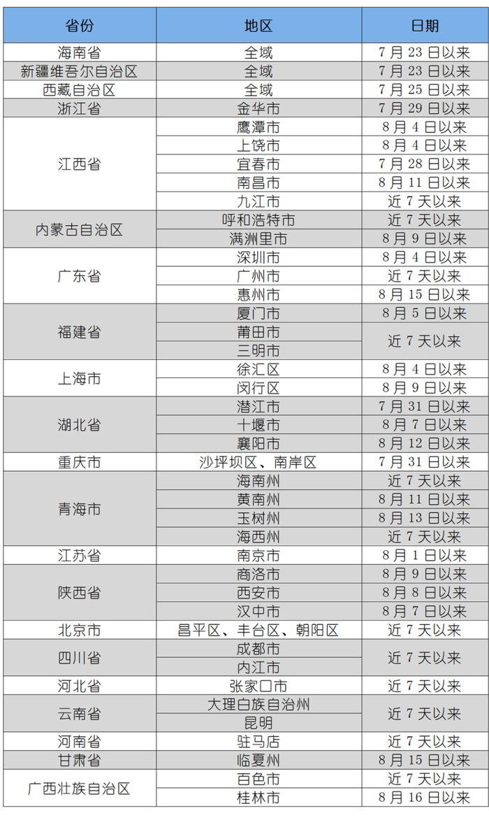 具体包括:8月11日以来有湖北省襄阳市南漳县、福建省泉州市晋江市,8月8日以来有陕西西安市, 8月9日以来有陕西商洛市,8月12日以来有重庆市旅居史,近7天以来有海南省、新疆维吾尔自治区、西藏自治区旅居史或国内中高风险区所在县(区、市)或有本土疫情发生县(区、市)旅居史的来(返)株人员。