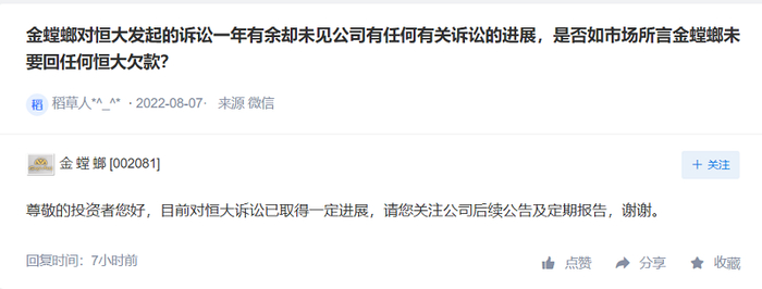 今年6月份,金螳螂就对外表示,与恒大的官司正在正常推进中,已有部分回款,其余正在积极协商中。