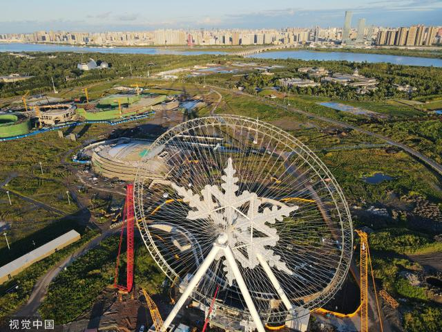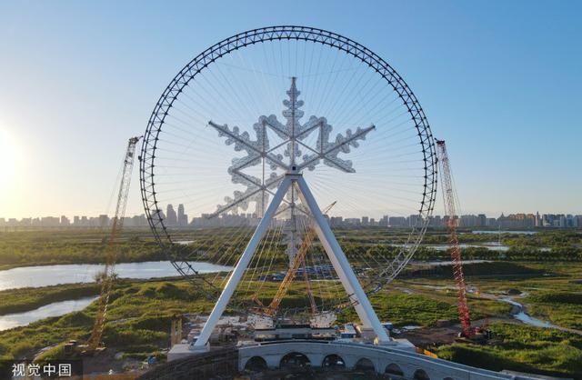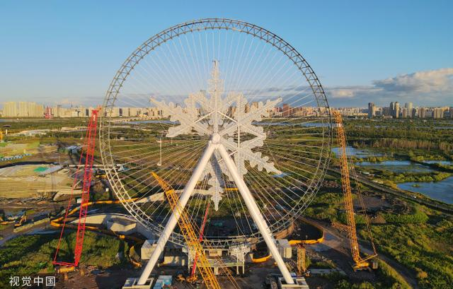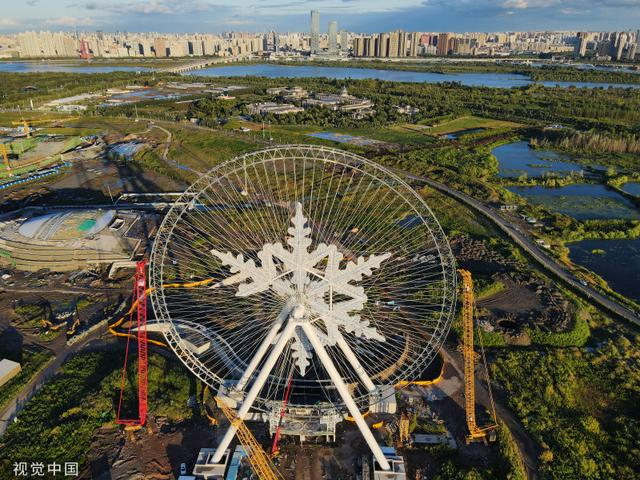 2022年8月19日,哈尔滨冰雪大世界在建摩天轮的雪花叶片安装即将完工,6瓣“雪花”已经安装完5瓣,剩下的一瓣正在安装中。
