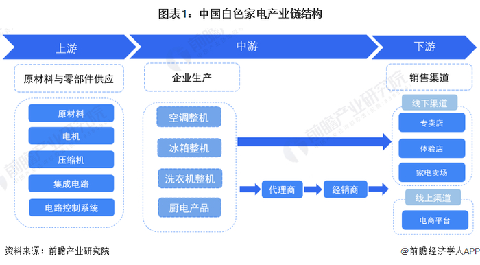 白色家电产业链上游为原材料及零部件供应,主要涉及压缩机、电机、电加热器、家用阀件、家电外壳材料等;中游为白色家电整机制造企业,主要为空调整机制造、冰箱整机制造及洗衣机整机制造;下游为销售端,主要分为线上销售渠道和线下销售渠道。