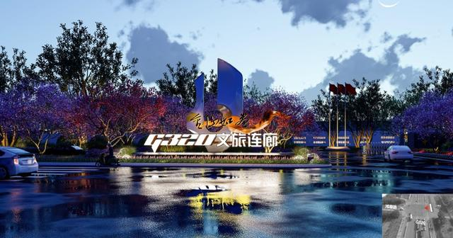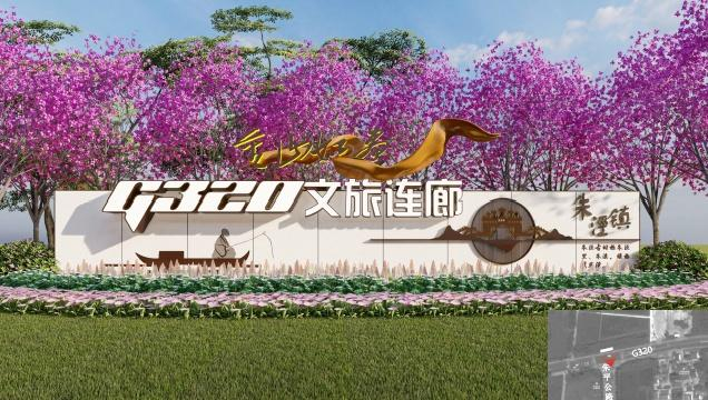 G320朱泾段整体将以红绡紫绮为主题,种植巨紫荆、紫花泡桐、紫玉兰、金边黄杨等极具观赏性的植物。并计划在主要节点鸿尊路交叉口设置文旅连廊LOGO标识,进一步提升文化旅游形象,在蒋泾中心路交叉口增加植物景观,美化环境。金廊公路交叉口、沈浦泾南路交叉口、朱平公路交叉口三个次要节点以植物造景为主,保留原有乔木,梳理凌乱植物,增加开花类植物,使入口植物主题更突出,绿化带中设计G320文旅连廊标志的景墙,景墙以船子和尚划船垂钓作为前景,以山水倒影作为背景,勾勒出一幅极具禅意的山水画卷。