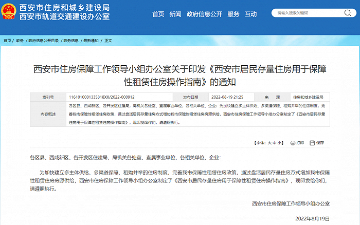 为加快建立多主体供给、多渠道保障、租购并举的住房制度,完善我市保障性租赁住房政策,通过盘活居民存量住房方式增加我市保障性租赁住房房源供给,西安市住房保障工作领导小组办公室制定了《西安市居民存量住房用于保障性租赁住房操作指南》,现印发给你们,请遵照执行。
