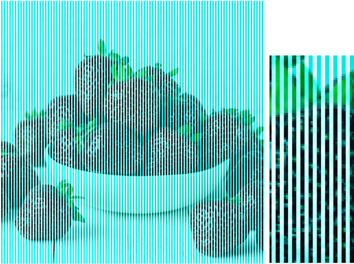以上这种效应被称为颜色同化网格视错觉[6],当然我们也可以把网格设计的更加密集,到单个像素的尺度,“伪彩色”照片中大多数像素是灰度的事实会更难被发现。
