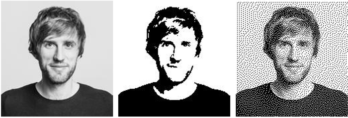 例如我们要显示国外某哥们的这张灰度照片,如果直接把不同像素的灰度值硬性近似为纯黑色或者纯白色,浅灰色就一律“四舍五入”为白色,深灰色就一律“四舍五入”为黑色,最后的结果就像第二张图那样惨不忍睹,整个一张“大花脸”。