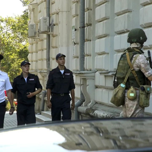 ▲当地时间2022年7月31日,克里米亚,一名俄罗斯士兵在塞瓦斯托波尔的俄罗斯黑海舰队司令部守卫。(人民视觉)