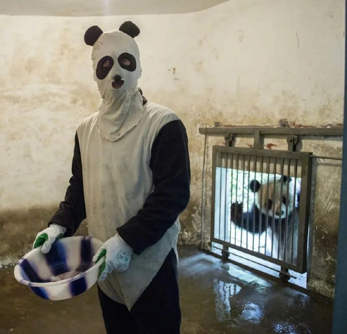 工作人员变身“熊猫人”的照片