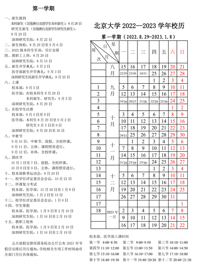 新京报讯(记者杨菲菲)8月20日,北京大学公布了新学期时间安排,2022级本科新生于8月28日报到,研究生新生于8月29日报到;校本部新生将于9月2日、医学部新生将于9月3日进行开学典礼,9月5日新生将正式上课。同时,2023年1月9日至2月19日,校本部、医学部学生放寒假。