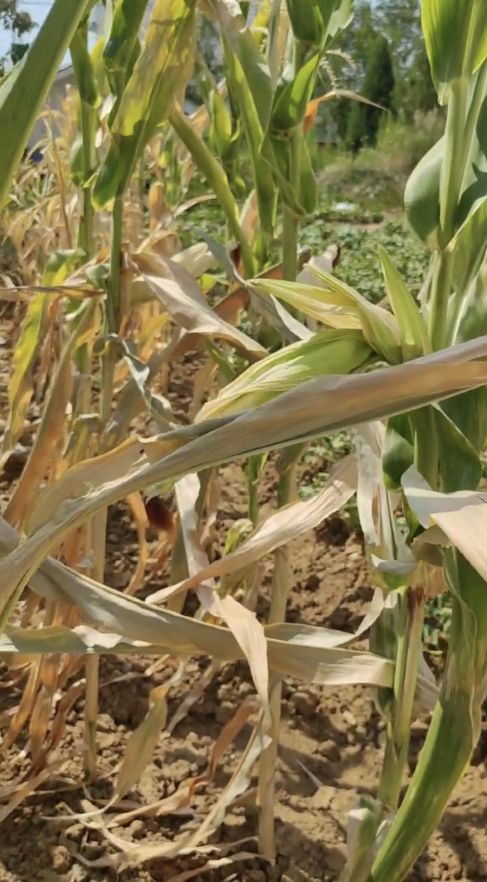罗成家里种了一亩多的玉米,再加上红薯、花生、青椒、茄子、土豆,加起来有三亩地。正是授粉、抽穗的时候遇上高温,地里的玉米要么是空杆,要么长到一半就停了,玉米叶“枯得用火机一点就着”。青椒仍然是小小一株,长不起来,也结不出果。茄子虽然长出来了,也是小小一点,皱巴巴的,跟老了一样。红薯和花生干脆直接绝收,“花生叶一碰就碎,看着真的心酸又恼火。”