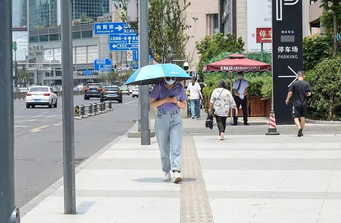 2022年7月13日,成都持续高温,市民全副武装出行(图|视觉中国)