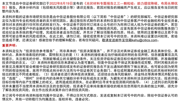 8月四川限电或将推高工业硅价格与多晶硅生产成本,受极端天气与能源结构转型影响,长期电价中枢可能上移,增强低能耗产能的竞争优势。3Q22预计国内多晶硅新增投产3.25万吨/月,或将冲击后市价格。我们判断多晶硅行业将先经历阶梯式降价,后面临全面供过于求,短期来看,假设组件含税价1.75元/W、下游硅片、电池、组件环节利润增厚0.12元/W,我们测算多晶硅价格中枢为162.3元/kg。光伏产业发展的主线是降本增效,后续多晶硅行业面临供给增加压低价格与电价上升推高成本的双重压力,先进产能在能耗、成本方面优势明显,落后产能面临淘汰风险。