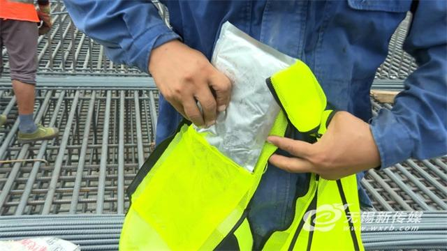 为加速推进项目建设,工人们劲往一处使,项目部也贴心地为他们寻找“凉爽”。“你看,我背后和胸前有4块‘冰’,穿着干活凉快多了。”钢筋工张传堂脱下身上的马甲给记者看,原来这是项目部为缓解暑气,为工人们购置的“降温背心”,里面可以放4块硬凝胶。记者试穿一下,瞬间感觉到后背和胸前一阵凉爽。高温期间,工人们人手一件,里面填充的硬凝胶可冰冻后反复使用,很受工人们欢迎。