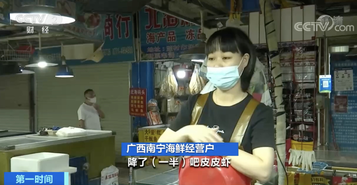 广西南宁海鲜经营户:一斤花蟹之前都是70元-80元,皮皮虾超百元,现在价格降了一半,一斤皮皮虾是50多元,花蟹相对比较便宜,一斤是40多元。此外,各种螺类的价格也有所下降。