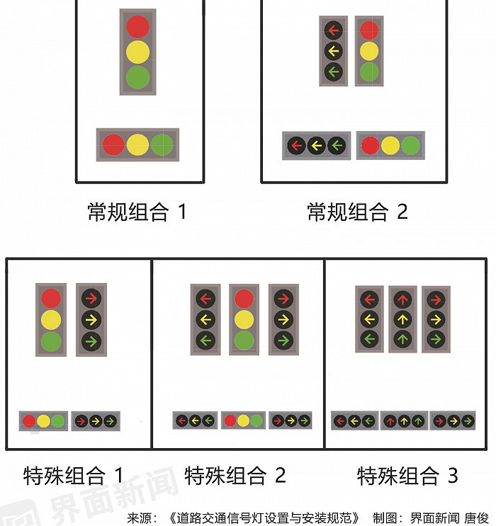 争议中的“新版红绿灯”主要是上述特殊组合2,根据国家标准,这种形式的信号灯较少使用。如需安装此类信号灯,路口需同时满足这些条件——设有左转专用导向车道、且左转车流较大需单独设置左转信号灯,同时设有右转专用导向车道、需通过控制右转车辆来减少对被放行的车辆和行人的影响。