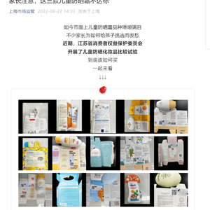 中国网财经8月22日讯 (记者 钟文鑫)据上海市场监管局微信公众号消息,近期,江苏省消费者权益保护委员会开展了儿童防晒化妆品比较试验。