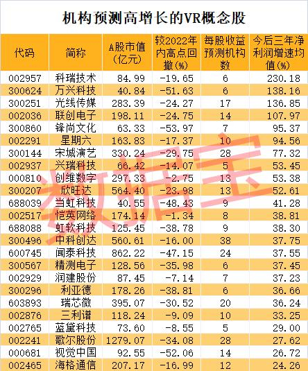 按照5家以上机构一致预测数据,今后三年24股净利润增速均有望超过20%。科瑞技术净利润增速均值230.18%排在首位,2021年公司AR/VR产品领域实现销售收入0.74亿元,同比增长46.2%。与年内高点相比,上述24股中,最新收盘价与年内高点相比,锋尚文化、视觉中国、万兴科技、当虹科技、闻泰科技等5股回撤幅度超40%。