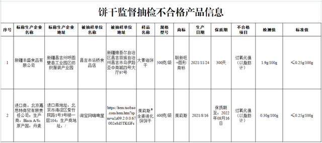 (一)新疆维吾尔自治区昌吉回族自治州昌吉市运桥食品店销售的、标称新疆丰盛食品有限公司生产的大黄油饼干,其中过氧化值(以脂肪计)检测值不符合食品安全国家标准规定。
