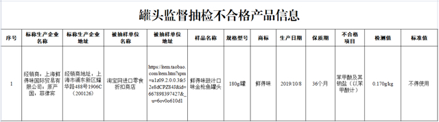 淘宝网进口零食折扣商店(经营者为江西省抚州市临川区亮雪美食食品店)在淘宝网(网店)销售的、标称上海鲜得味国际贸易有限公司经销的鲜得味豉汁口味金枪鱼罐头(原产国:菲律宾),其中苯甲酸及其钠盐(以苯甲酸计)检测值不符合食品安全国家标准规定。